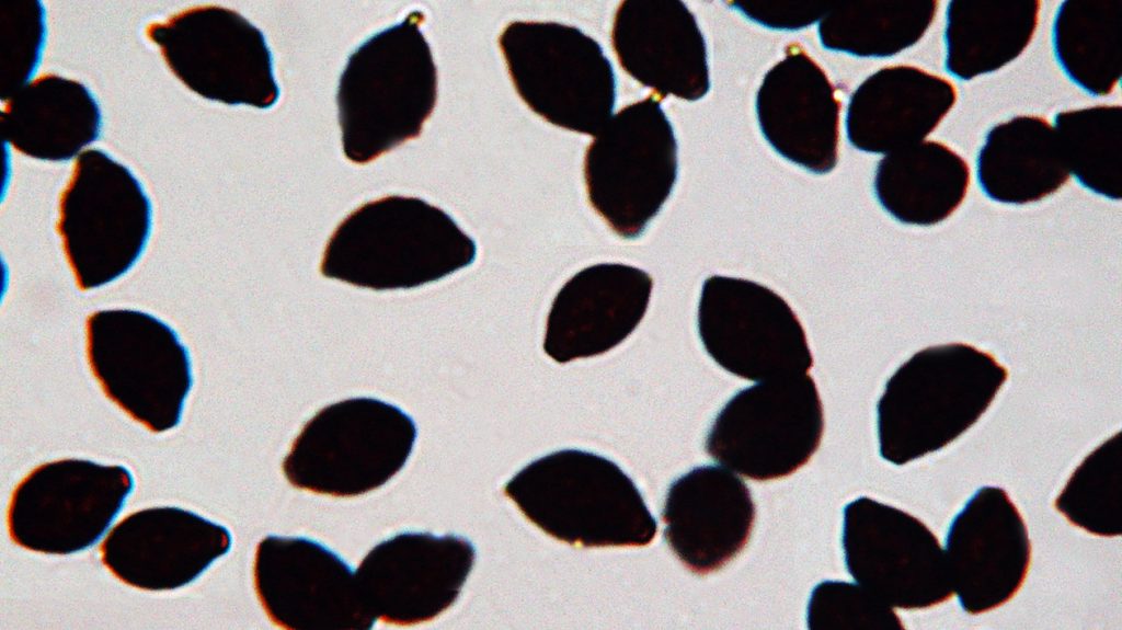 Esporas : Esporada negra, esporas citriformes (con forma de limón) a amigdaliformes (almendra) de 10-14 x 6-8 micras, rugosas.