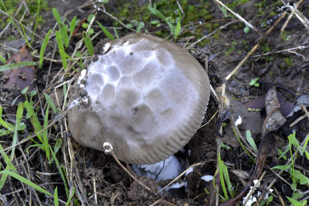 Sombrero : Inicialmente hemisférico campanulado, después plano convexo, sin mamelón, aplanándose en la madurez. De entre 5 y 12 cms. de diámetro, margen excedente e incurvado y marcadamente estriado. cutícula de seca a viscosa, separable, cubierta por pequeños resto de volva de tonos blancos grisáceos y normalmente bastante adheridos, que al desprenderse dejan verse depresiones amplias y evidentes semejantes a abolladuras, de ahí su nombre «martilleada». Es de color gris aunque con frecuentes tonalidades ocres.