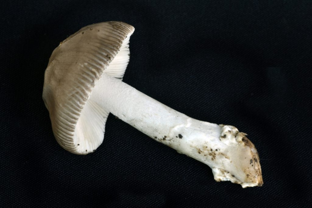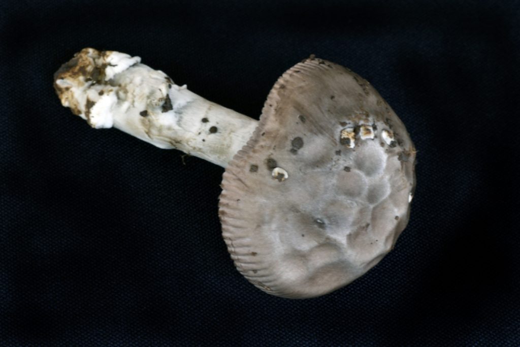 Pie : De 6-15 x 1-2 centímetros, cilíndrico, esbelto, ensanchado hacia su base, levemente bulboso,superficie finamente escamosa, blanca y grisácea en la madurez. Volva sacciforme frágil que se rompe en pedazos más o menos flocosos.