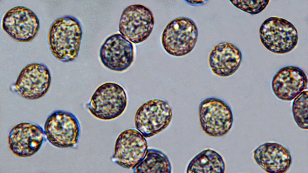Esporas : Esporada blanca, esporas globosas a elípticas de 8-9 x 11-12 micras, lisas, no amiloides.