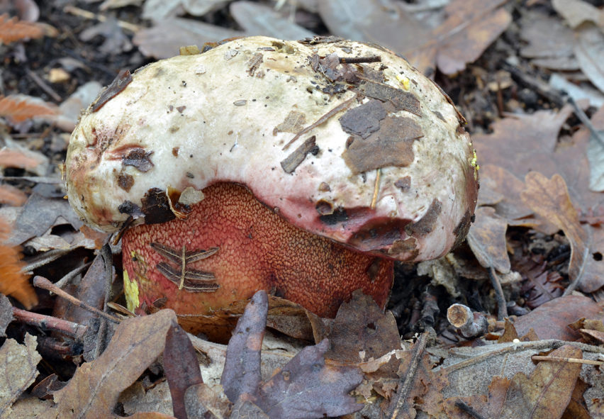 Pie: De 5-12 x 2,5-6 cm, obeso, terminando en punta, con la edad se alarga y se vuelve cilíndrico. Amarillo vivo en el ápice y rojo hacia la base, adornado por un retículo rojo vivo de mallas regulares. Micelio amarillento. Es frecuente verlo astillado en clima seco, o comido por limacos, dejando ver su carne amarilla.