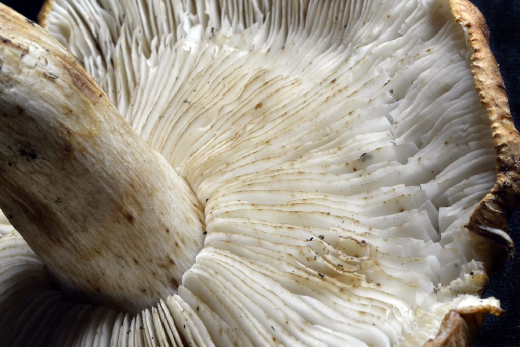 Láminas : Escotadas, blancas, con lamélulas, apretadas, de color blanco, sus aristas se vuelven pardas con la edad.