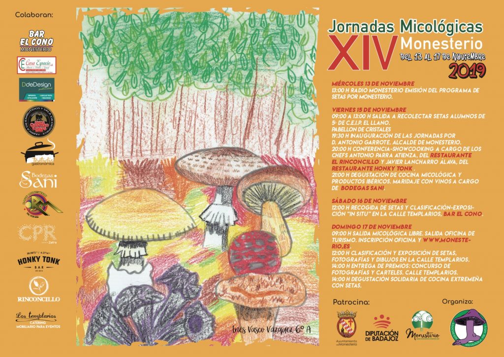 Una de las actividades de las que nos sentimos mas orgullosos, es el concurso de dibujos, del que participan anualmente los cursos, 5º y 6º de Educación Primaria, al cabo de los años todos los críos del colegio de Monesterio han tenido la oportunidad de participar en el concurso, consiguiendo así uno de nuestros primeros propósitos, llevar el conocimiento y el respeto hacia el mundo micológico a las nuevas generaciones; El dibujo premiado, lo usamos como base de nuestro cartel para las jornadas micológicas de cada año.
